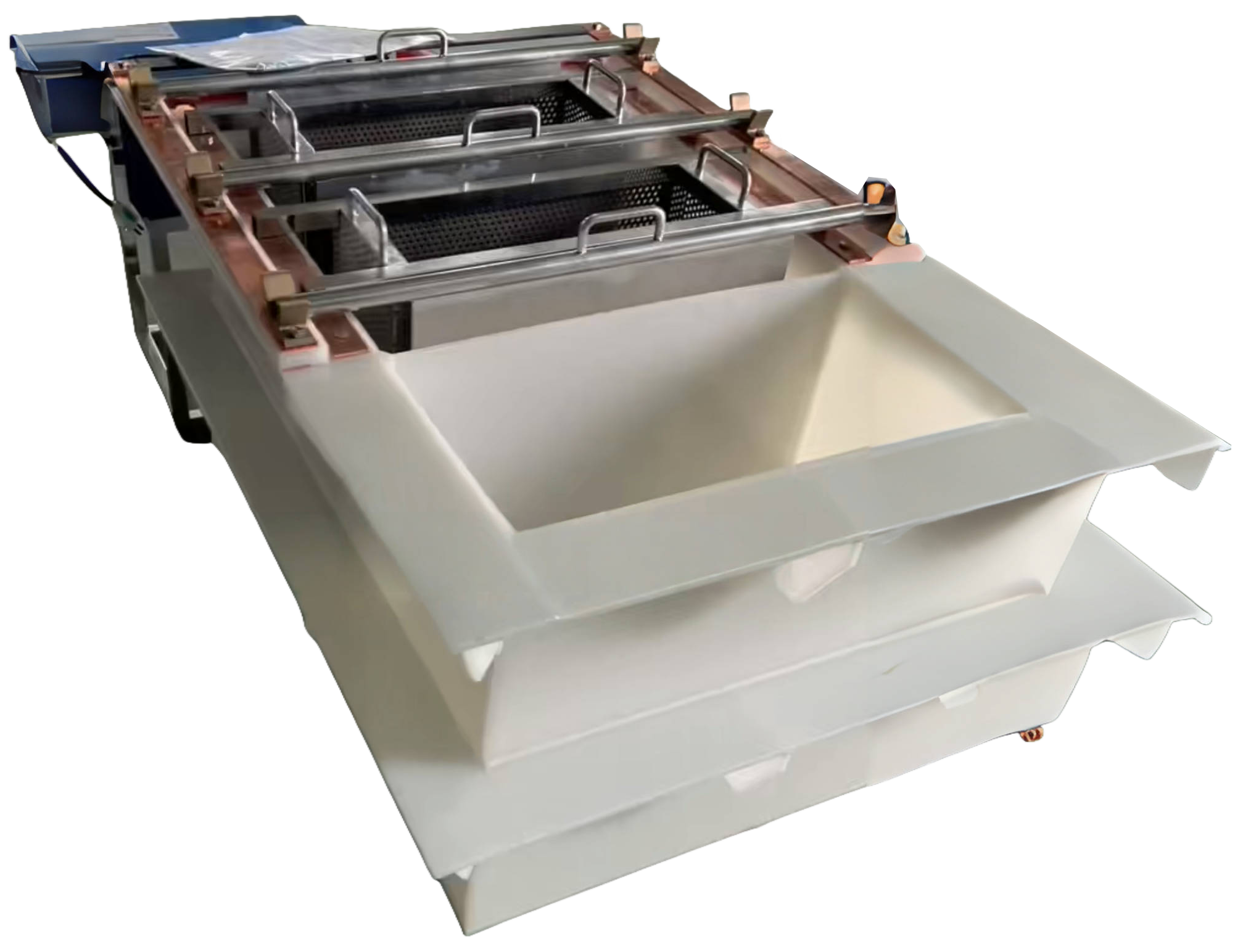 Another key advantage of this system is its ease of operation and safety. The machine is built from PP (polypropylene) anti-corrosion material, resistant to acid, alkali, and high temperatures. The stainless-steel baskets and iron crane ensure long-term stability even under continuous operation. Our automatic control system provides adjustable current and voltage, ensuring precise stripping performance without damaging the base metal.